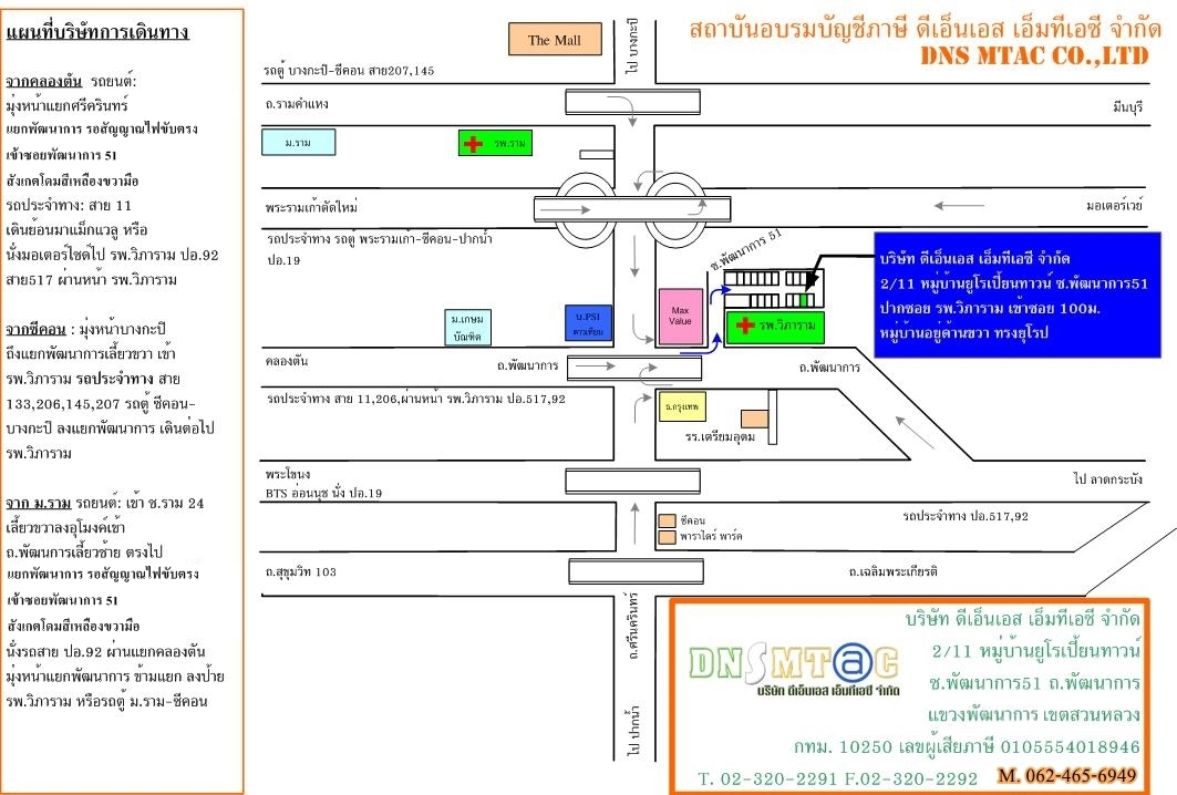 รถยนต์ : เดินทางด้วยวงแหวนตะวันออก ออกทางศรีนครินทร์ซ้ายมือ (สังเกตมัสยิด) ข้ามรางรถไฟ จะเห็นแยกพัฒนาการ (แยกแม๊กเวลู พัฒนาการ) ให้เลี้ยวซ้ายขับรถตรงมาประมาณ 200 เมตร สังเกตซ้ายมือ จะเห็นซอยพัฒนาการ 51 ให้เลี้ยวเข้ามา จากปากซอยประมาณ 50 เมตร จะเห็นหมู่บ้านรูปทรงแบบ ยุโรป อยู่ฝั่งขวามือ ให้เลี้ยวเข้ามาและจอดรถตามป้ายที่ตั้งชื่อ DNS